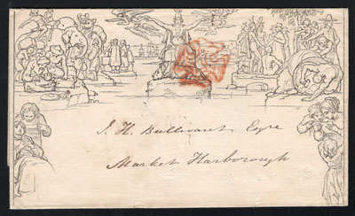 1840 1p Black Mulready Letter Sheet, mailed from London on JUN.5.1840 (c.d.s. on back) to Market Harborough, with Maltese Cross in red, properly placed on the Queen's Statue. The letter sheet is Stereo A18 and has a few small faults, still presents fine. (Image)