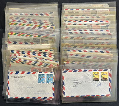Group of About 100 Interesting Bolivian Covers, 1939-1963, consisting of mostly airmail, but also domestic and registered usages with many having business corner cards. Most have high rate frankings and all covers are sleeved and very fine. Our pictures show an overview as well as some examples. (Image)