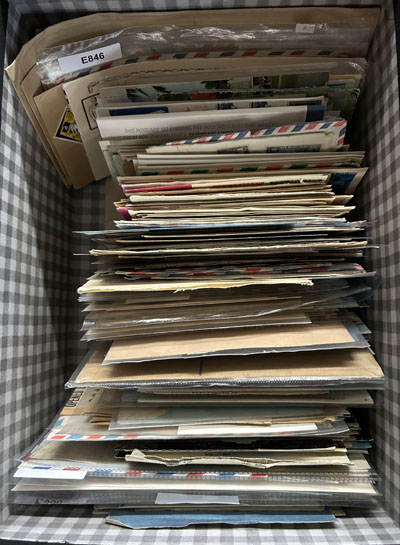 Group of About 550 British Commonwealth Country Covers and Cards, with a wide variety of material from Australia and States, New Zealand, Caribbean, Africa, Gibraltar, Hong Kong, Pacific islands, India, etc., with no Canada or GB. We note lots of airmail, registered, frankings, postmarks, censored, aerogrames, many 1937 first days, and much more, with many mailed to Canada. Some have faults, still overall fine with some better, see photos to get a good idea of the contents. (Image)