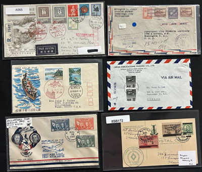 Group of About 130 Covers and Cards from Asian Countries, including Japan, Indonesia, Philippines, Korea and more. Note many airmail rates, many were mailed to Canada, some FDC, commercial mail and more. A few have small faults, else overall fine or better. (Image)