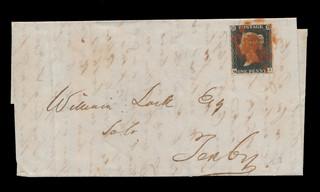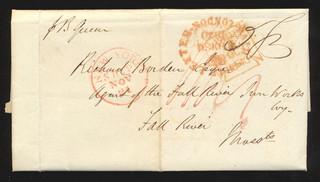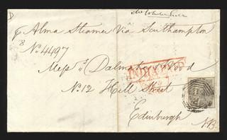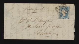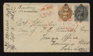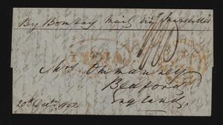 1852 (20 December), Barrackpore to Bradford, Bombay via Marseilles, stampless folded letter, datelined Barrackpore, rated 1/10 in manuscript, handstruck INDIA oval, endorsed at top "by Bombay Mail via Marseilles", Bombay transit backstamp (5 Jan, 1853), indistinct boxed backstamp, Bedford double split-ring (31 Jan) on front, a pretty cover. (Image)