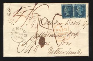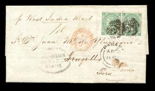 1855 (March 15), London to Trujillo, Peru, via Panama, folded letter, franked with 1sh pair (Sc.48, Plate 4), tied by dual strikes of London '24' barred oval, red "Lombard Street / Paid" c.d.s. alongside, endorsed in manuscript "per West India Mail", Panama double split-ring (8 Apr) struck below, reverse with straight-line TRUJILLO receiver in black, redirected thence to Lima, whereupon struck with oval "CONDUCCION DEL CARTERO GRATIS" in black, light wrinkles and the odd trivial toned perf, else fine; this letter travelled on the R.M.S. Seine, which arrived in St. Thomas March 31, then left next day and via the R.M.S. Tyne, arriving in Colon on April 7th.(Image)