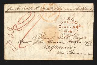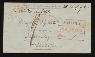 1846 (25 August), Poona to Bellevue, Guernsey, stampless cover, rated 1sh, oval INDIA in red and boxed POONA AUG 26 datestamp, endorsed "via Southampton" to Major Rynd, Bellevue, Guernsey, with red 13 Oct c.d.s. transit and GUERNSEY (16 Oct) double split-ring arrival backstamp, fine. (Image)