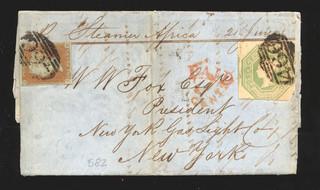 1851 (June 21), 1sh and 1d on transatlantic cover to New York, both adhesives with three clear margins, tied by "466" horizontal barred oval of Liverpool, endorsed in manuscript "per Steamer Africa", red PAID arc and "5 Cents" struck alongside 1sh, each applied upon arrival in the United States, reverse with JU 21 oval transit alongside Liverpool double split-ring, filing fold or some discolouration along sides, else fine. (Image)