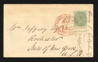 1860 (April 30), 1sh margin single on transatlantic cover to New York, franked with 1sh pale green, with bottom margin "4 Shillings / per Row of 3" sheet margin imprint, tied by London 'W29' duplex and red "New York / 24 / Am Pkt / May 14", "21 Cents" struck alongside, no backstamps, an unusual franking, fine. (Sc. 28a) (Image)