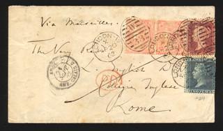 1862 (September 2), London to Rome, Italy, mixed franking cover, with 1d red brown (Sc.11), 2d blue (Plate 9, Sc. 29), and 4d vermilion pair (Sc. 34), all cancelled by London W/33 duplex, red oval PD and Amb Calais transit struck in France, reverse with "Roma Via Di Mare" hooded circular datestamp (24 Sep), some wrinkling and surface abrasions to the 4d pair, else a nice early franking. (Image)