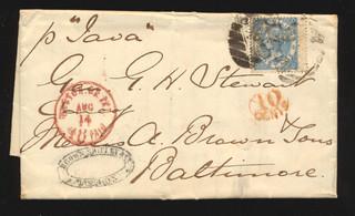 1867 (August 3), 2sh blue single franking transatlantic cover to Baltimore, folded letter, with contents, 2sh blue (Plate 1), tied by '48' barred numeral of London, endorsed in manuscript "p Java", red "Boston Br Pkt / 48 Paid" below (14 Aug), red "10 Cents" struck upon arrival in the United States, framed London datestamp in black on reverse, light edge creasing, a scarce solo franking. (Sc. 55) (Image)