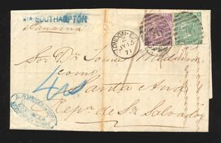 1871 (July 15), London to Santa Ana, El Salvador, via Panama, folded letter, franked with 6d lilac (Plate 9) and 1sh green (Plate 5), tied by London '76' duplex, with dater die "Z" normally indicative of a late fee, this apparently paid in cash as noted by the adjacent manuscript "1", "4" (reales) in blue crayon denoting the rate for domestic delivery, handstruck blue "VIA SOUTHAMPTON" route directive with "Panama" in manuscript below, carried on the R.M.S. Nile which arrived in Colon on August 7, vertical crease with slightly fraying, else fine. (S.G. 109, 117) (Image)