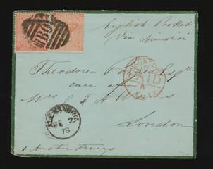 British Offices in Egypt, 1873 (February 9), Alexandria to London, cover franked with pair of 4d (Plate 12), tied by black B01 vertical barred oval of Alexandria, with corresponding c.d.s. (9 Feb) alongside, endorsed “English Packet Via Brindisi,” red London PAID c.d.s. receiver (17 Feb), a fine and most attractive cover. (Sc. Z17) (Image)