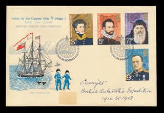 1972, Robert Scott Antarctic Expedition survivor-signed First Day Cover, franked with Polar Explorers set (Sc. 664-7), with Philart fundraising cachet, signed by C.S. Wright, the only Canadian on the ill-fated 1910-1913 expedition, who led the search party and was the first to find Scott's tent where the expedition leader perished, trivial gum residue on front from detached label, not detracting from this desirable and otherwise very fine cover. (Image)