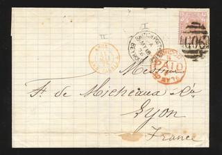 British Levant, 1876 (May 18), "G06" Beirut to Lyon, France, folded cover, without contents, franked with 2½d rosy mauve (Plate 3), tied by black G06 barred oval, British Post Office Beyrouth c.d.s. alongside, London PAID c.d.s. (30 May) and next-day "Angl/ Amb Calais" transit further struck on front, reverse with Lyon arrival c.d.s. (1 Jun), small stains near bottom, else fine. (S.G. Z6) (Image)