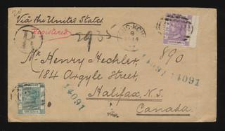 1886 (April 14), 10c & 30c definitives on registered cover to Halifax, Nova Scotia, franked with 10c green and 30c violet, the latter a wing-margin example, tied to cover with black B62 barred oval, endorsed “via the United States”, with c.d.s. arrival backstamp (19 May), a fine-very fine and uncommon usage to Canada. (Sc. 20, 43) (Image)