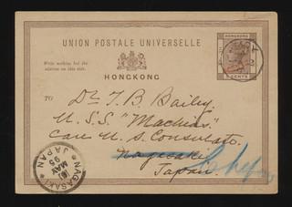 1895 (May 2), 4c on 3c overprinted stationery card, Amoy, China to Japan, posted from Amoy, China, to Nagasaki, apparently re-directed to Chefoo per blue crayon manuscript notation, Shanghai c.d.s. (9 May) transit, tiny tear at upper right, else fine-very fine. (H&G 12) (Image)