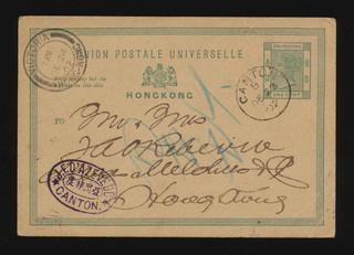 1902 (December 23), 1c postal stationery card, incoming from Canton, China, used as a Christmas and New Year’s greeting card, posted to Hong Kong from Canton, with Victoria double-circle c.d.s. receiver (24 Dec), fine-very fine. (H&G 4) (Image)