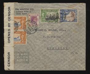 1941 (September 24), multi-franking censored cover to Honolulu, Hawaii, franked with 50c red violet and 5c, 25c, $1 (2) pictorial issues, tied by Victoria c.d.s., sent via airmail, with censor seal along left, minor tone spots, but an uncommon Second World War destination, sent just over two months prior to the attack on Pearl Harbour, fine-very fine. (Sc. 162, 170, 172, 173) (Image)