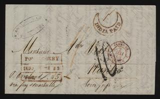 1850 (23 March), Pondicherry to Nantes, France, stampless folded letter, rated 1sh in manuscript, handstamped "10" (decimes) in black for payment by recipient, handstruck "India Paid" crescent and boxed Pondicherry (23 Mar) datestamp, to Nantes, endorsed in manuscript "P. Overland A5 via Suez & Marseille", "INDIES OR/MARSEILLE 2 Mai 50" transit, with same-day "Ligne-De-Tours" and next-day Nantes arrival backstamp, horizontal slit below "Nantes" on front, attractive and fine. (Image)