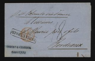 1860 (21 December), Calcutta to France, Unpaid, stampless folded letter, datelined Calcutta, with red "G.P.O. EX / CALCUTTA / DE 22 1860" b/s, rated '18' in black, to Bordeaux, France, boxed INDIA UNPAID, endorsed "P. Str. Colombo via France" in manuscript, with "Cette A Toulouse" (25 Jan) and next-day "Toulouse a Bordeaux" TPO transit backstamps, Bordeaux c.d.s. receiver, a pleasing cover. (Image)