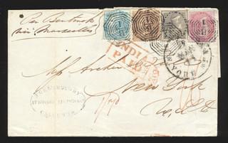 1860, ½a blue, 1a brown, 4a black and 8a carmine, Atkinson, Tilton & Co Forwarding Agent, each stamp tied to cover by "B/1" octagon, handstruck INDIA PAID in red, "E.X. Calcutta G.P.O. JA 7 1860" b/s, to New York, neatly-struck "Forwarded by Atkinson, Tilton & Co Calcutta" oval, rated 1/7d in red manuscript, London transit c.d.s. (18 Feb) and New York receiver (5 Mar), light vertical fold through 8a and a few other small faults to adhesives, yet a desirable four-color franking. (Image)