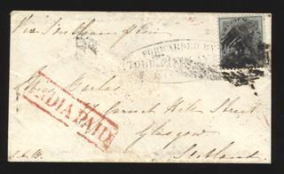 1860, 4a black, Todd, Findlay & Co Rangoon Forwarding Agent, adhesive tied to small cover by indistinct octagon and oval "FORWARDED BY / TODD, FINDLAY & Co./ RANGOON" cachet, red boxed INDIA PAID, to Glasgow, Scotland, with G.P.O EX Calcutta (9 Mar) and red boxed "RANGOON SHIP LETTER" backstamps, Glasgow (20 Apr) arrival backstamp, trivial toning to edges, a scarce Burmese usage; the firm of Todd, Findlay & Co was founded by James Todd and Thomas Findlay, who operated the Burma Steam Tug Co.(Image)