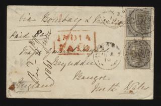 1861, two 4a grey black, tied by "56" duplex, to Bangor, North Wales, boxed "INDIA / PAID" in red, endorsed "via Bombay & Marseilles / Paid 8as" in manuscript, red "EX BOMBAY" transit backstamp, fine. (Image)