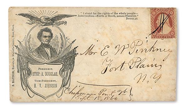 1860 Douglas & Johnson, in black, right-facing portrait of Douglas in ornate frame with flag-draped shield below, S. Raynor imprint at left, and two-line quotation at right; franked by 3¢ dull red Washington (#26) tied by manuscript cancel on cover to Fort Plains, N.Y.; docketing below serves as manuscript postmark for "Chipman's Point, Vt/Sept 18, 1860"; light soiling overall, stamp with faults at top from placement, Fine to Very Fine. Bischel 283 var. Walcott W-132 var. (Image)