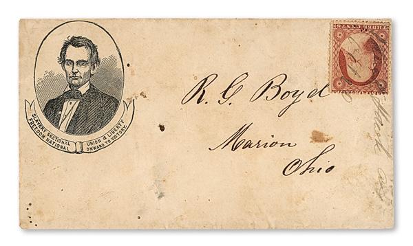1860 Beardless Lincoln, framed portrait facing left, in black with "Slavery Sectional/Freedom National//Union & Liberty/Onward to Victory." slogan in ribbons below; franked by 3¢ dull red Washington (#26) tied by manuscript cancel dated Oct. 20 (town name difficult to read); some staining and toning, but generally sound, Fine to Very Fine. Bischel 315. Walcott W-unlisted. (Image)