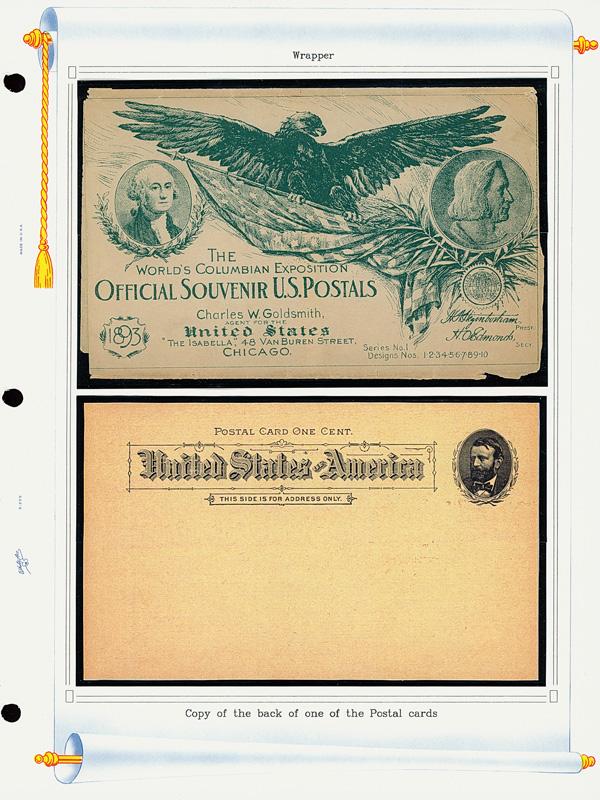 1893, Columbian Exposition "Goldsmith" Picture Post Cards, with Original Wrapper, Series #1, Design #1-10 complete, plus original wrapper in green, all mounted on White Ace album pages; the post cards bright and sound, the wrapper with some expected wear along edges or folds, still Very Fine. (PDF for this Lot) (Image)