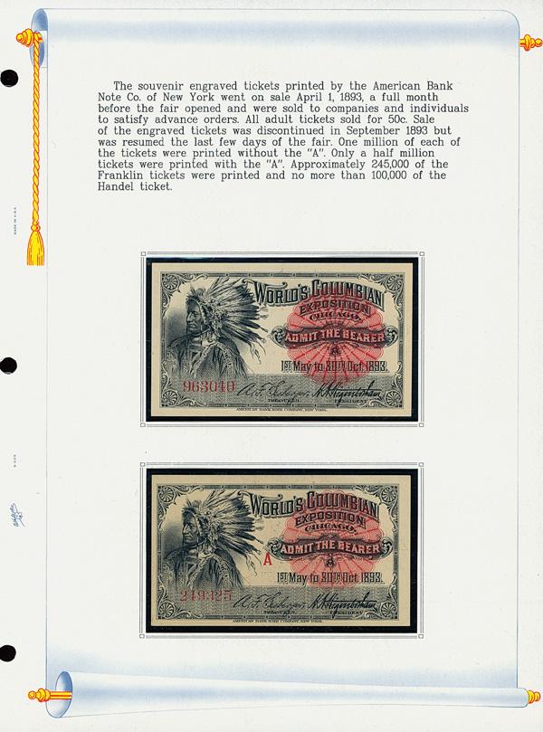 1893, Columbian Exposition, collection of entry tickets, 27 different, mounted on White Ace pages in a binder, accompanied by introduction and annotation throughout; comprises Indian, Columbus, Washington and Lincoln general tickets, Franklin "Complimentary" and Handel "Music", plus "Good Only on Day of Sale", Children's Tickets and Special Day Tickets; nearly all fresh and bright, "Special Day" tickets complete with counterfoils; a lovely holding and a solid foundation on which to build, Very Fine. Shipping charges apply - weight 2.4 lbs. (PDF for this Lot) (Image)