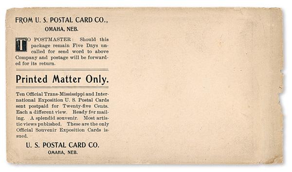 1898, Trans-Mississippi Exposition post cards, with original envelope, complete set of ten, printed on #UX14, presented on Lindner hingeless pages; while the cards are relatively common, the bonus original envelope with full-height printed "corner card" for Omaha's U.S. Postal Card Company is most definitely not—we do not recall having seen another; cards pristine, the envelope lightly soiled and roughed up a bit at right, Very Fine, a must-have for the Trans-Miss enthusiast. Shipping charges apply - weight 0.6 lbs. (PDF for this Lot) (Image)