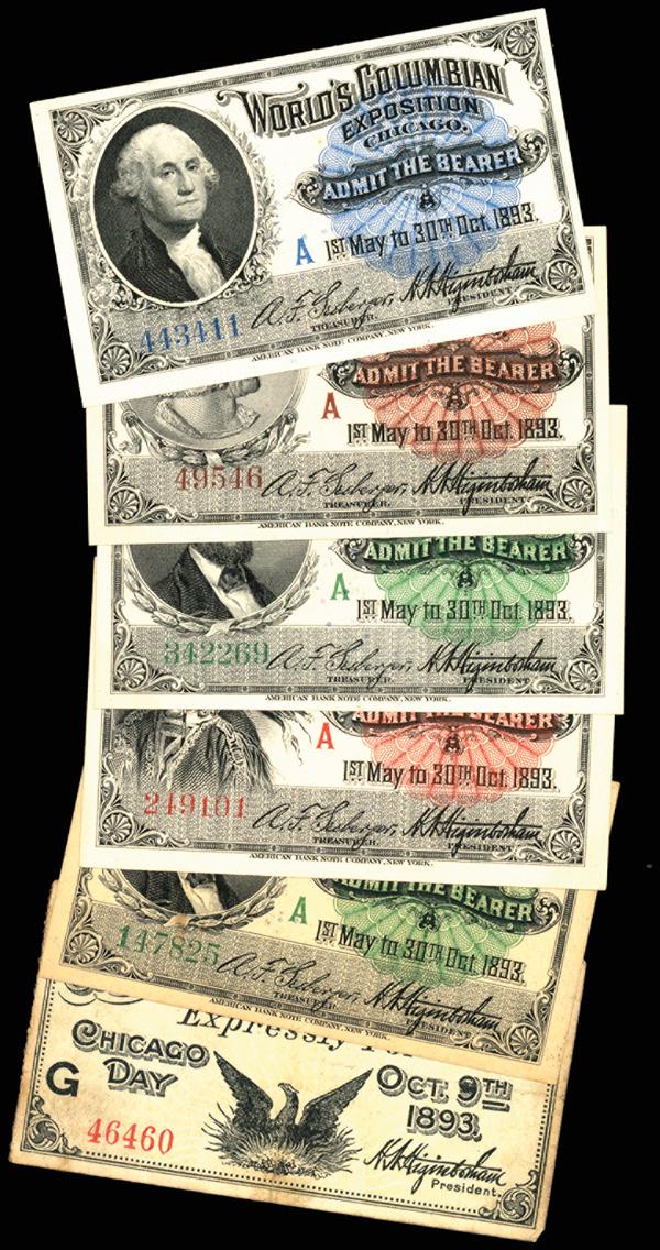 1893 Columbian Exposition Admission Tickets Collection, lot of 6 tickets, 5 printed by the American Bank Note Company, portraits of Columbus, Washington, Lincoln and other images on the face of each, all are intaglio printed, all are AU to Uncirculated except for the "Childrens" Ticket which is in fine condition. (6). (PDF for this Lot) (Image)