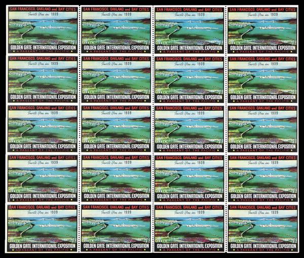 1939, Golden Gate International Exposition labels, imperforate between horizontally, complete sheet of 20, attractive, large multicolor label, with sheet margin straight edges as usual, unperforated horizontally; accompanied by normal sheet for comparison, o.g., never hinged; light separations at top center, otherwise Very Fine. (Image)