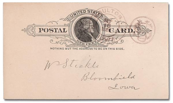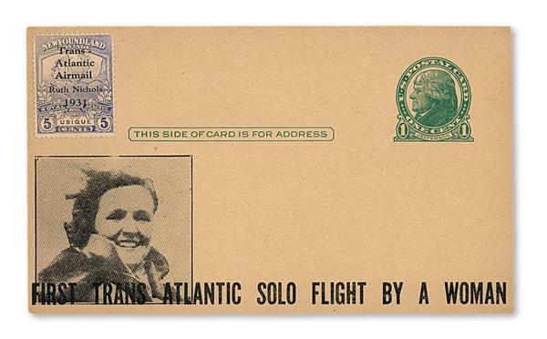 1931 (June), Ruth Nichols Trans-Atlantic Solo Flight postal card, US 1¢ Jefferson postal card (#UX27) with privately overprinted Newfoundland 5¢ Ubique (#119 var.), the card with printed photo of Nichols and "First Trans Atlantic Solo Flight by a Woman" at bottom, the flight aborted when she crashed and was injured in New Brunswick; card unused and unaddressed; accompanied by print-out of Nichols' Wikipedia page, Very Fine, an interesting item for the early aviation enthusiast. (Image)