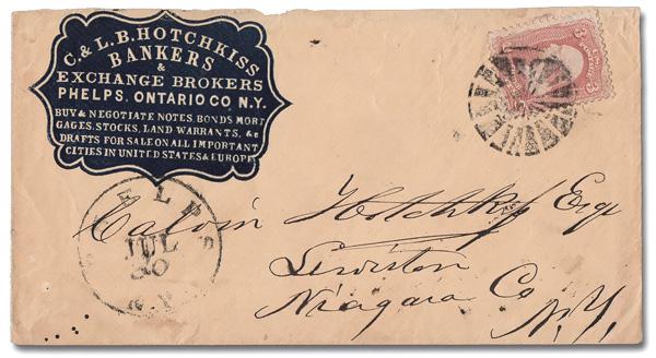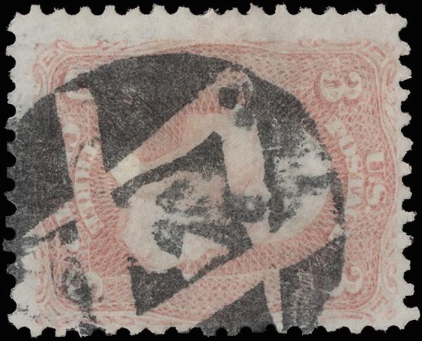 Masonic "Open Book" of Rutland, Vt., excellent strike on a 3¢ rose (65); average centering but fresh and sound. Skinner-Eno FR-M5 1. (Image)