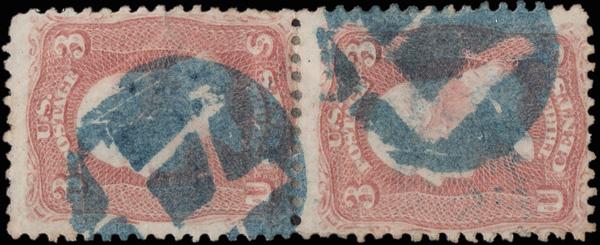 Negative Masonic Square & Compass (Skinner-Eno FR-M3a 17), two bold 70% strikes in blue on a hinged-together vertical pair of 3¢ rose (65); much clearer than the Skinner-Eno illustration. (Image)