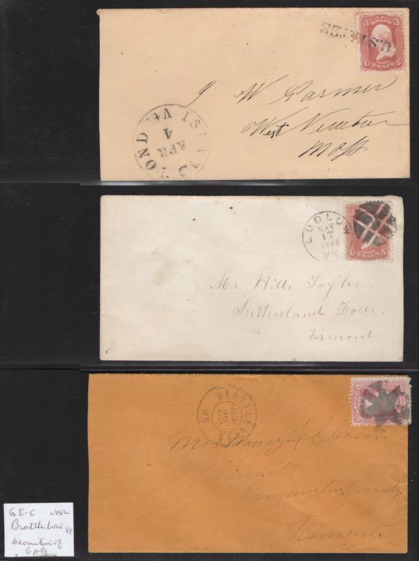 Geometric Cancels of Vermont on 3¢ 1861s, 14 covers (one non-Geometric: Island Pond "U.States") including four in blue, on 3-row, 2-sided stocksheets; mostly nice strikes and clean covers, generally Fine to Very Fine. (Image)