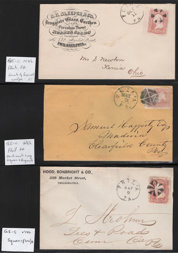 Geometric Cancels of Connecticut on 3¢ 1861s, 16 covers on 3-row, 2-sided stocksheets; includes a red paint Rosette from Manchester; mostly nice strikes and clean covers, generally Fine to Very Fine. (Image)