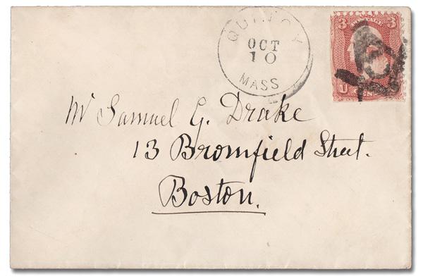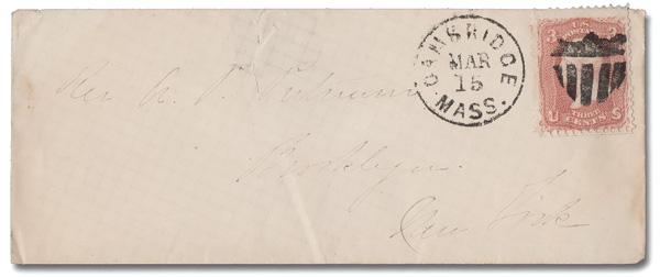 Shield with 5 Bars, Solid Top of Cambridge, Mass. (Skinner-Eno PS-S 15), absolutely perfect strike on a 3¢ rose (65) (not tied) beside a Mar 15 Cambridge c.d.s. on a cover to Brooklyn, N.Y. (Image)