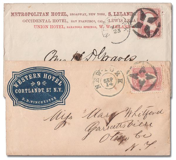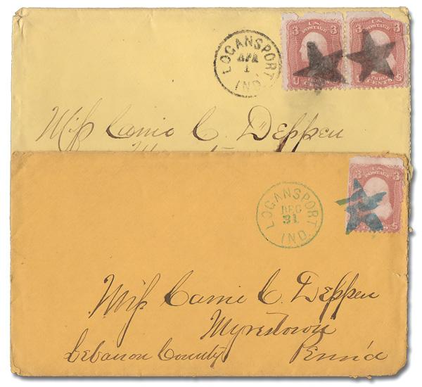 Star of Logansport, Ind. (Skinner-Eno Unlisted), two covers from the same correspondence to Myrestown, Pa., showing two different states of the device; the first with two bold complete strikes tying a pair of 3¢ rose (65) next to an Apr 1 Logansport c.d.s.; the second, in blue, showing three splits in the device, is equally bold and ties a single 3¢ rose (65) next to a matching Dec 31 Logansport c.d.s.; the former also includes the original letter, datelined Peoria, Ill., May 18, 1866. A marv pair. (Image)