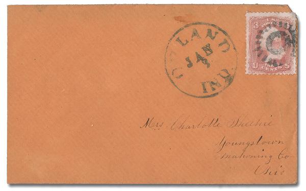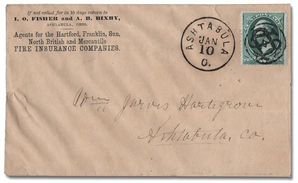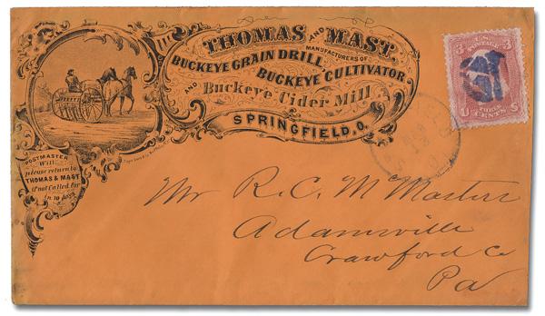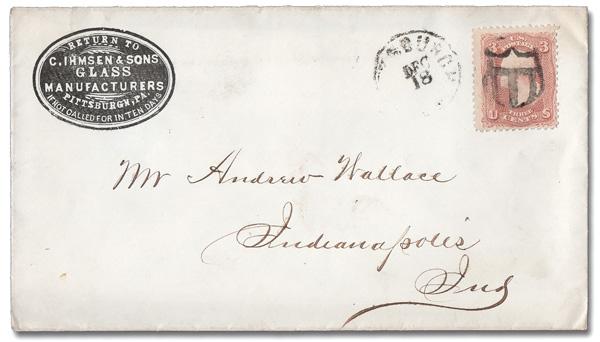Shield with 3 Bars, Open Top of Pittsburgh, Pa. (Skinner-Eno PS-O 9), choice early, "socked-on-the-nose" impression on a 3¢ rose (65) (not tied) alongside a partial Dec 18 Pittsburgh c.d.s. on a cameo-style advertising cover for C. Ihmsen & Sons Glass Manufacturers; top flap missing. (Image)