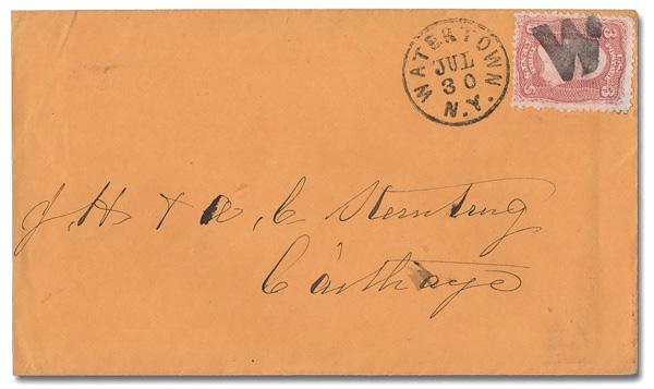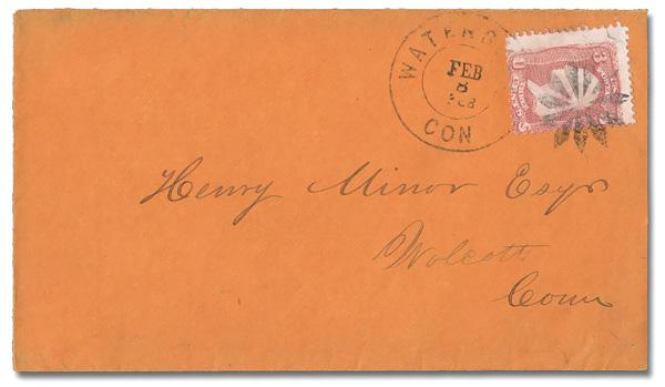 11-Point Rosette of Waterbury, Ct. (Skinner-Eno GE-R 64), complete strike, alongside a T-1 Waterbury c.d.s., Feb 8. 1868, ties a 3¢ rose (65) on an orange cover to Wolcott, Ct. Rohloff Rarity RRR (fewer than nine known). Rohloff P-29. (Image)