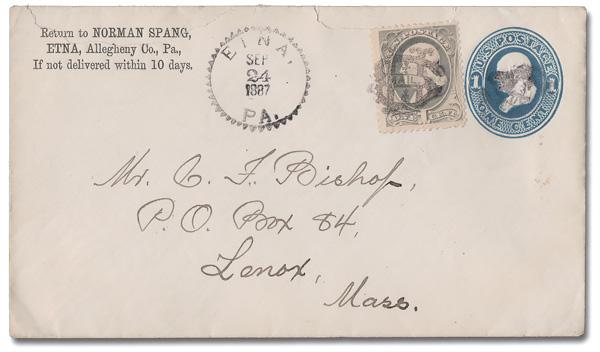 "US MAIL" Monogram of Etna, Pa., nice strike ties a 1¢ gray blue (206) on a 1¢ entire (U113) — a second, barely recognizable strike cancels the indicium — to Lenox, Mass. with an unusual Etna sawtoothed c.d.s., Sep 24, 1887; backstamped New York (Sep 25) and Lenox the next day; opened a bit roughtly at the top, otherwise Very Fine. Cole U-151. (Image)