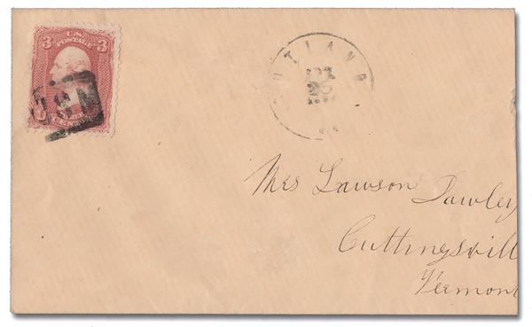 "U S M" in Rectangular Frame of Rutland, Vt. (Skinner-Eno Unlisted), nice, nearly complete strike ties a 3¢ rose (65) on a slightly reduced cover to Cuttingsville, Vt. with a light Rutland c.d.s., Apr 26, 1862. (Image)