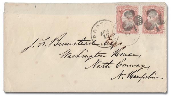 Clover of Boston, Mass. (Skinner-Eno PP-C 5), two beautiful strikes, duplexed with Boston c.d.s.s, tie a pair of 3¢ rose (65), with double perforations between on a cover to North Conway, N.H. (Image)