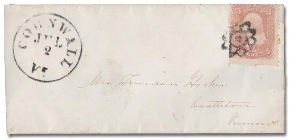 Flower of Cornwall, Vt. (Skinner-Eno PP-FL 27), nice strike ties a 3¢ rose (65) on a small cover, with a bold Jul 2 Cornwall c.d.s., to Castleton, Vt. (Image)