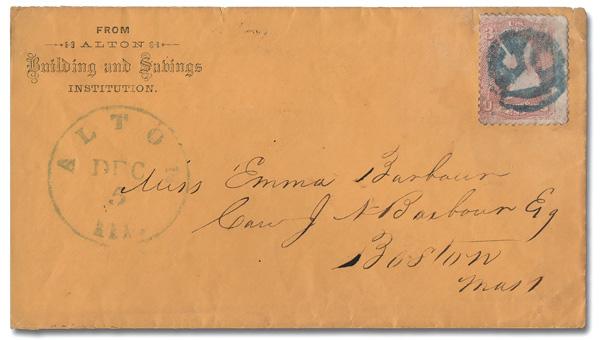 Pumpkin Face of Alton, Ill. (Skinner-Eno Unlisted), bold, virtually complete strike on a 3¢ rose (65) (not tied) on a cover to Boston, Mass.; postmarked with a matching Dec 5 Alton c.d.s. and bearing an Alton Building and Savings Institution corner card. (Image)
