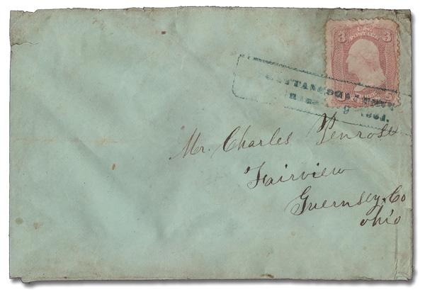 "CHATTANOOGA, TENN./ MARCH 9, 1864" (Skinner-Eno PM-TS 2 sim), fairly complete framed postmark in blue ties a 3¢ rose (65) on a cover to Fairview, O. A nice example of this rare town cancel; the Skinner-Eno illustration shows only a "T." instead of "TENN."(Image)