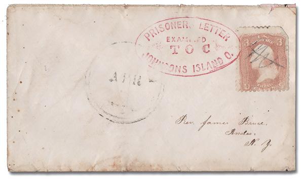 <"PRISONERS LETTER/JOHNSONS ISLAND O.",red oval with "EXAMINED/T O C" ties a pen-canceled 3¢ rose (65) on a small cover to Andes, N.Y.; illegible town cancel. Very uncommon in in red.(Image)