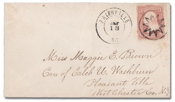 10-Point Star in Circle of Palenville, N.Y. (Skinner-Eno GE-C 46a), clear, nearly complete strike cancels a 3¢ rose (65) alongside a Sep 18 Palenville c.d.s. on a small cover to Pleasant Ville, N.Y. (Image)