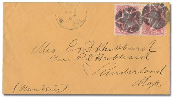 Negative 5-Point Star in Circle of Hartford, Ct. (Skinner-Eno Unlisted), two exceptional strikes of this distinctive cancel tie a pair of 3¢ rose (65) on a clean cover to Sunderland, Mass. with a partial Hartford c.d.s. (Image)