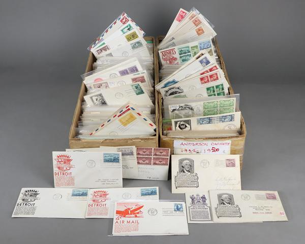 Anderson First Day Cover Stock, 1932-77, about 1,800 better cacheted First Day Covers in a pair of 2-foot-deep dealer boxes; most are addressed, some are sleeved; generally in chronological order with light duplication, perfect for the merchant with hungry collectors, Fine to Very Fine. Shipping charges apply - weight 19 lbs. (Image)